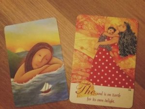 A második lapom meg… Pont ennek az ellentéte, a piros, pöttyös ruhás lány, karjában egy gyerekkel. A tűz, a szenvedély, a piros, a pöttyök (mániám a pöttyös), az élénk színek. Megdöbbentő felismerést hozott már az első alkalom. Sosem hittem volna, hogy van annak jelentősége, hogy az ember milyen lapot húz ki egy pakliból. Csak úgy sorakoztak bennük a termékenységi szimbólumok, a nőiesség jelképei.