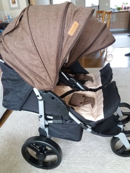 Aztán egy szép napon elmentünk a Babaszafari áruházába, ahol, amint beléptem az ajtón, megláttam egy kocsit, ami már első ránézésre is nagyon tetszetős volt nekem. A Chippolino Twix sötétbarna és bézs színkombinációja, az egymás melletti ülés elhelyezésekkel egyből lenyűgözött. Maga a kocsi egy kicsit vékonyabb kivitelű, mint a többi egymás melletti társa (lemértük a boltok be- és kijáratát, ahova gyakran járunk, simán beférünk vele). Nagy kerekekkel van ellátva, amik ráadásul egy fémpánttal vannak rögzítve a kocsihoz. A kocsi kereke természetesen kivehető, így csukott állapotban könnyen befér a csomagtartóba.